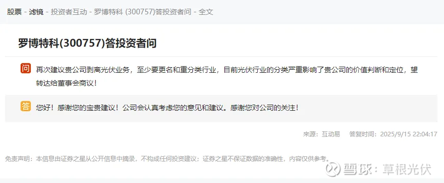近日,在网络上看到一个投资者问答后让人直感后脊发凉。这名投资者是这样向罗博特科(300757)提问的:再次建议贵公司剥离光伏业务,至少要更名和重分类行业,目前光伏行业的分类严重影响了贵公司的价值判断和定位,望转达给董事会商议!