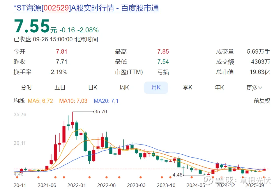 甘胜泉掌舵时期,海源复材有过脱星摘帽的高光,还有过股价一飞冲天创出35.76元历史新高的辉煌。但这一切已成为过去式,因2024年度利润总额、净利润、扣除非经常性损益后的净利润为负数且扣除后的营业收入低于3亿元,海源复材在2024年报发布后再次披星戴帽,兜兜转转回到了当初的原点。