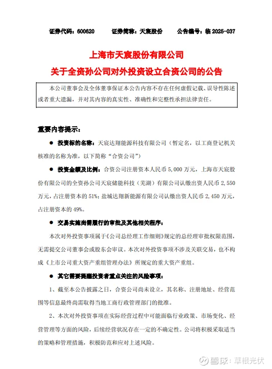 12月19日,天宸股份发布关于全资孙公司对外投资设立合资公司的公告称,其拟成立合资公司天宸达翔能源科技有限公司(简称“天宸达翔”)。