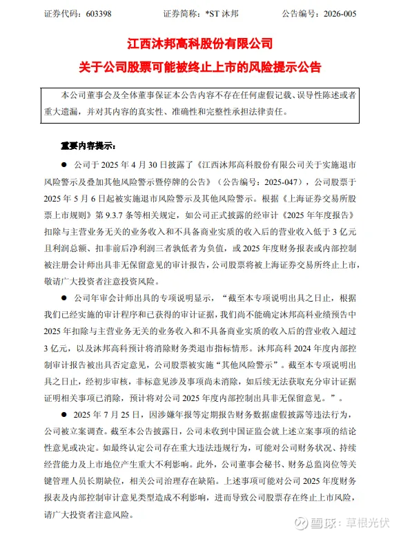对此,*ST沐邦在公告中也表示,公司董事会秘书、财务总监岗位等关键管理人员长期缺位,相关公司治理存在缺陷。上述事项可能对公司2025年度财务报表及内部控制审计意见类型造成不利影响,进而导致公司股票存在终止上市风险。