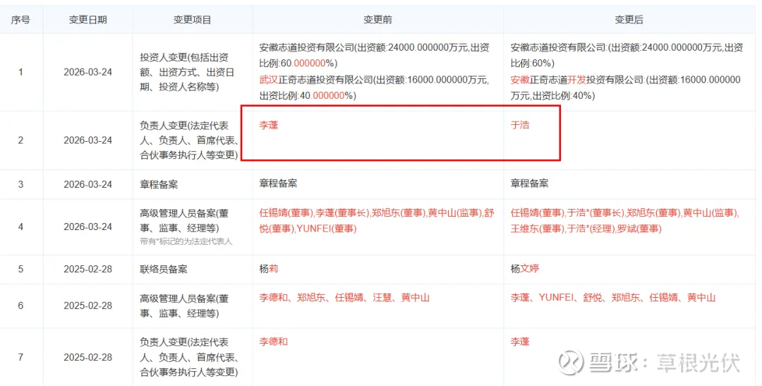 正奇光能成立于2023年4月3日,不到3年时间里已四换法定代表人、三换董事长。2023年8月16日,法定代表人由严乐平变更为李德和。2025年2月28日,由李德和变更为李蓬。2026年3月24日,由李蓬变更为于浩。