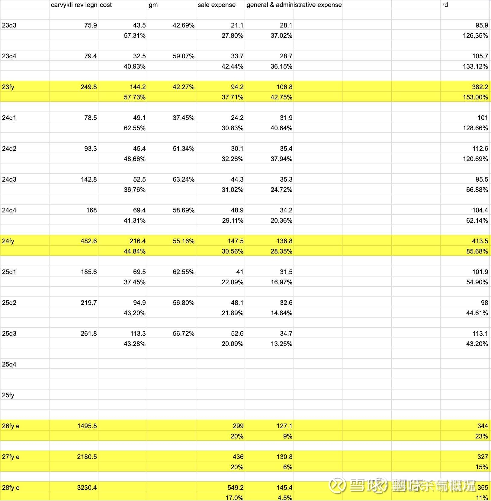 3下面算未来carvykti生命周期一共能带来多少营收。今年由于川不靠谱关门了一阵子导致raritan审批推迟,q4营收会比计划少一些,用k兄@Kertosis 每个季度都很准的拟合人数预测曲线,大概6亿美金这样子吧,也达到2025年19亿了。2026年由于raritan推迟没法按满产一万针起步,按8000针算也能有30亿了。2027年是满产一万针40亿了,但由于anito上市把4l+全部抢走了,得减掉。黄颖在q3财报时说60%以上的患者来自2-4l,那也就是少于40%在4l+,q3销量5.24亿,一个季度扣2亿,全年扣8亿,也就是年底32亿营收。假设这就是峰值了,未来都按这个数来算,一直到tec+dara2030年进入一线把bcma靶点用掉导致公司倒闭。majestec-7是22年开始入组,主要终点是pfs,对照组是DRd中位pfs是5年,2024年asco发布过中位随访13个月的数据,所以对照组的中位pfs大概是2028年asco达到,你要做出阳性起码得再长一年吧,那就是2029年asco发布,2030年获批进入一线。但之前的患者不管是三联还是四联医生总有个开单惯性,而且维持用药D+R也不少,就算2030年tec+dara把一线全灭了,之前累计的耐药cilta还是能够再一阵子,从严计算只能再卖一年吧。从26年到30年一共5年时间。32亿营收归传奇16亿,毛利不好算,这里借用谢兄@谢伯瑄 整理的表格: