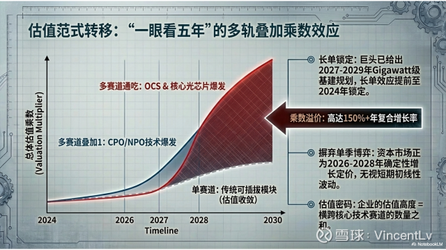 所以我觉得,今年其实就是“一眼定五年”的一年。从 2026 年开始,市场已经不是只盯着 2026 年本身,而是在为 2028 年、甚至 2030 年的产业格局提前定价。谁横跨的曲线最多,谁的卡位份额最好,谁就更值得重点关注。这也是为什么我们会讲,传统意义上 10 倍、15 倍的静态估值讨论,重要性已经在下降,市场更应该用更长视角去看这些光模块和上游器件龙头。