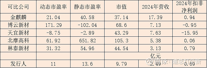 公司发行价11.66元,发行股份2092万股,其中网上发行1882.8万股,发行后市值9.79亿元,发行后流通市值2.22亿元。主承销商:招商证券,申购时间:2026年1月6日(星期二),上市板块:北交所。按2025年预告业绩中位值的预期市盈率为11,静态市盈率为13.6。可比公司市值、市盈率及营收情况如下: