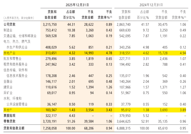 资产质量主要看不良贷款生产率,2025年招商银行不良贷款生产率为1.03%(2024年1.05%)资产质量继续向好。从行业分布来看,不良贷款主要集中在房地产业和其他(农林牧渔住宿餐饮卫生等行业)贷款当中。前期市场一直比较担心房地产业对银行资产质量的冲击,目前看不良贷款已经下降到4.78%。