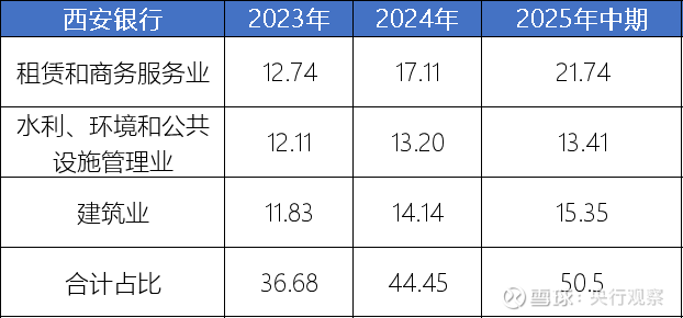 从行业分布看,其信贷资源呈现出高度的集中性。西安银行长期对接省内重大基建项目,其建筑业客户多为地方国企。历年财报显示,“租赁和商务服务业”、“水利、环境和公共设施管理业”与“建筑业”始终是其前三大贷款行业,2025年上半年前三行业的贷款增量占据了全行的98%。由此可以推断,其三季度的对公贷款,依然主要流向了上述政信类领域。