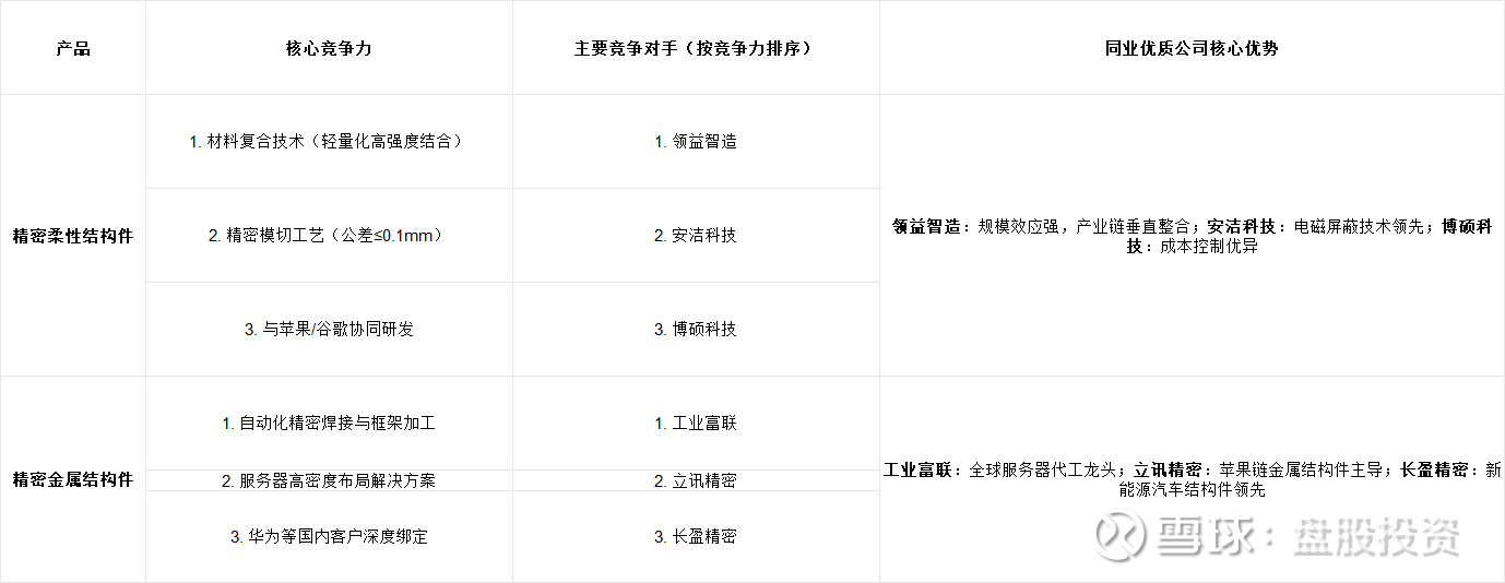 恒铭达在精密柔性结构件领域技术壁垒突出,但面临领益智造等规模竞争;在金属结构件领域受益于AI服务器国产化,但与工业富联等巨头仍有差距。