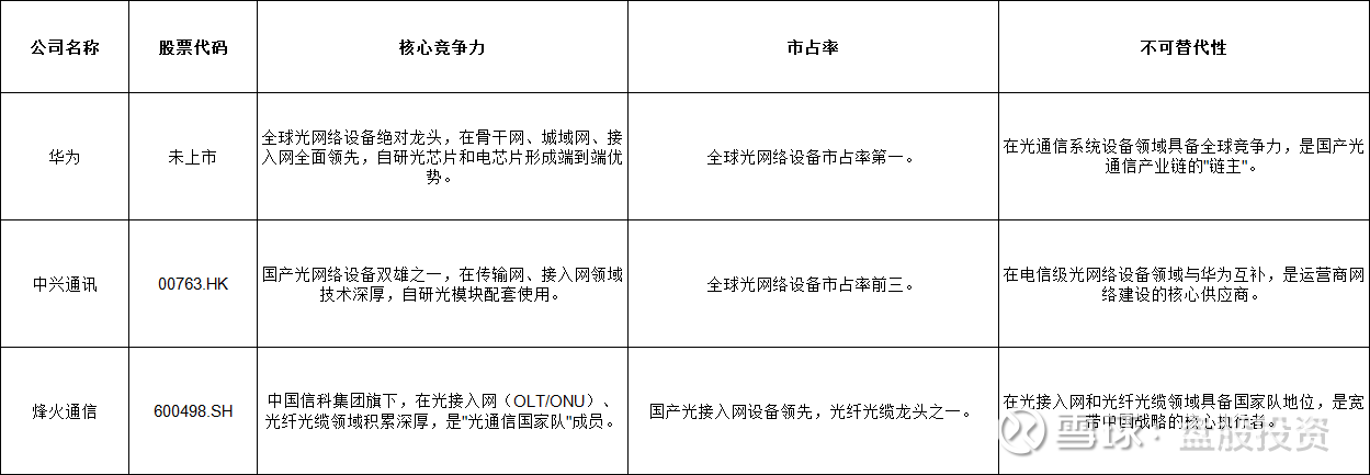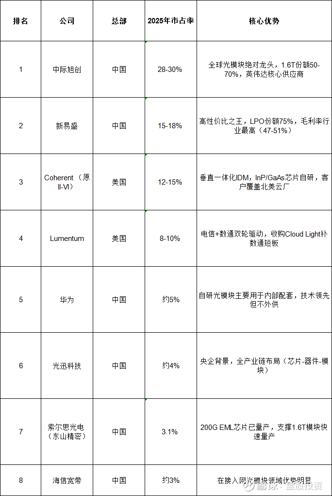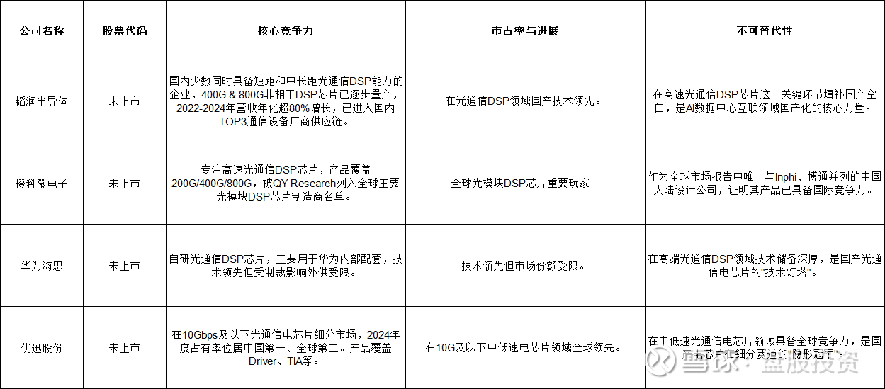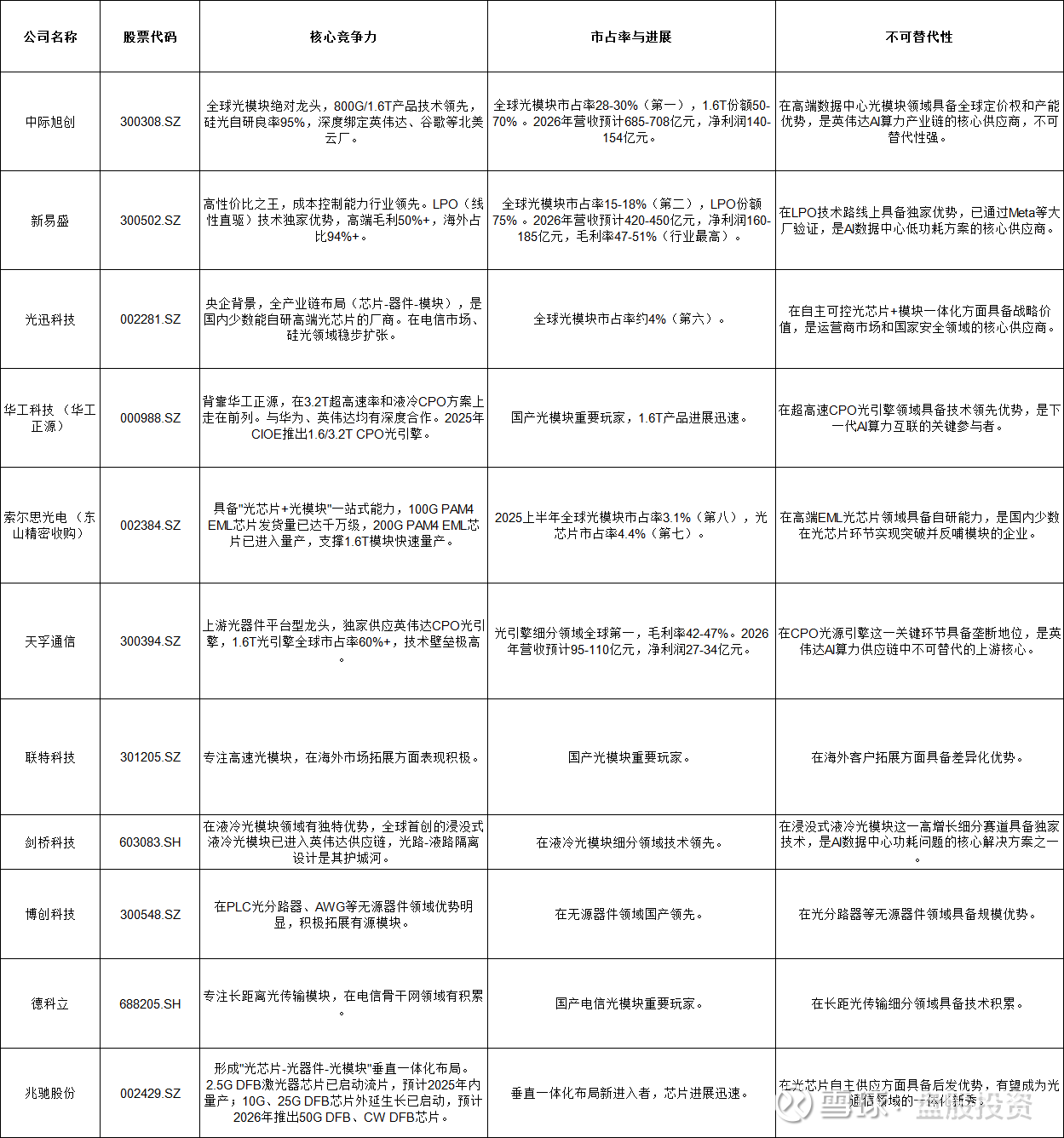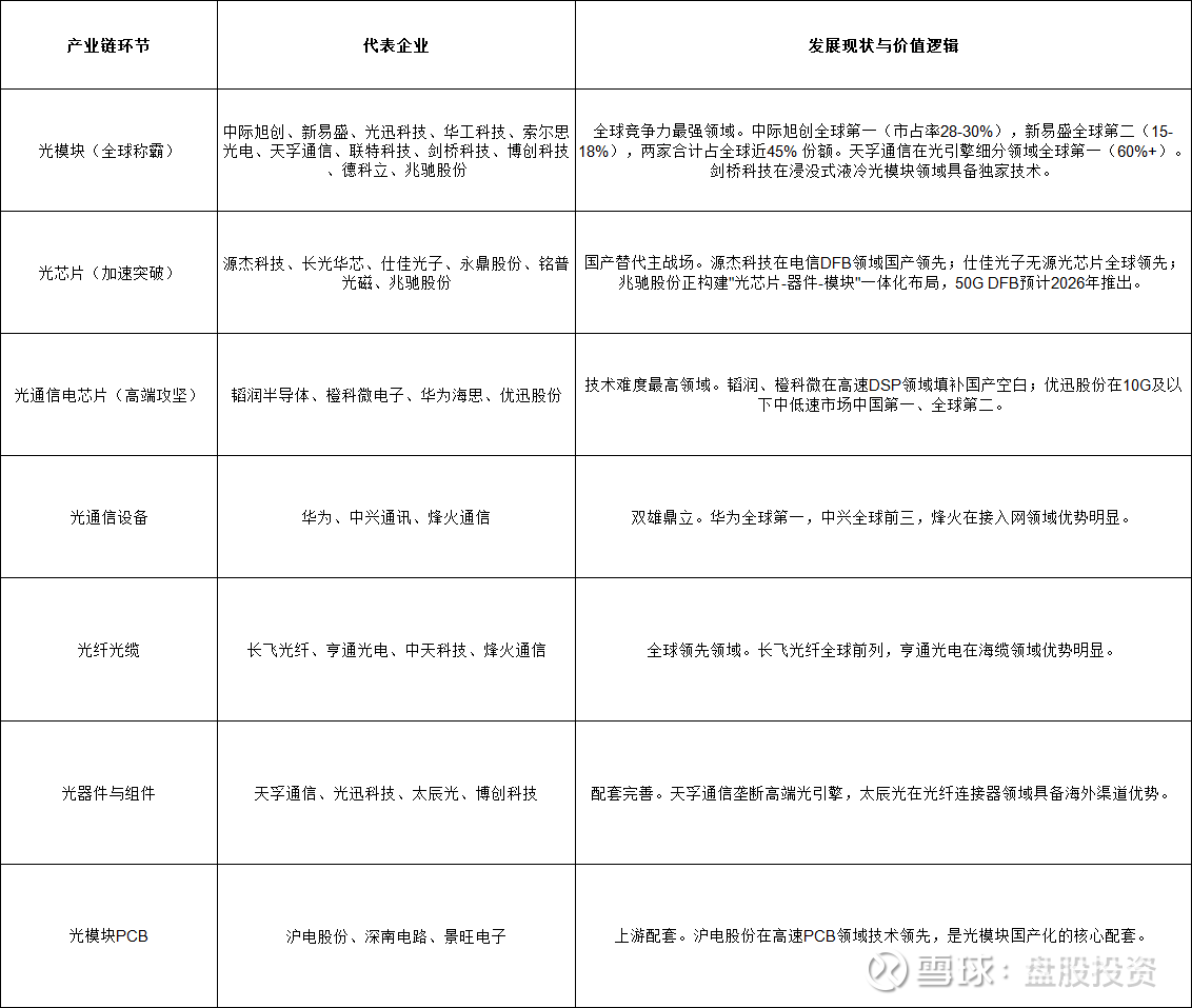 核心结论:中国光通信产业链已形成"光模块全球称霸(中际/新易盛)+ 光芯片加速突破(源杰/仕佳/兆驰)+ 电芯片高端攻坚(韬润/橙科微)+ 设备商双雄鼎立(华为/中兴)+ 上游配套完善"的完整格局。