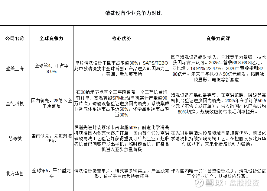 从整体竞争力来看,国产清洗设备是中国半导体设备领域中全球竞争力最强的细分赛道之一,已形成盛美上海全球龙头+至纯科技/芯源微国内领先的竞争格局: