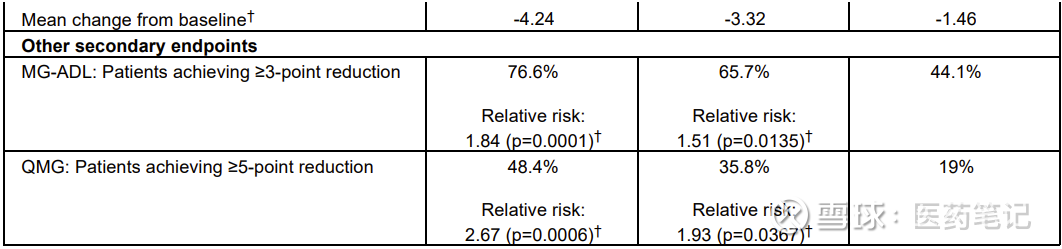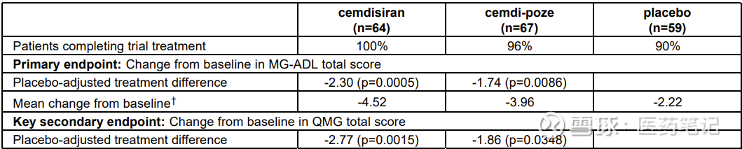 Cemdisiran单药治疗(600mg,每12周给药一次)24周,主要终点MG-ADL下降4.52%,安慰剂校正后下降2.30%,不过C5 siRNA+C5抗体(200mg+200mg,每4周给药一次)联合治疗组疗效并未增加。