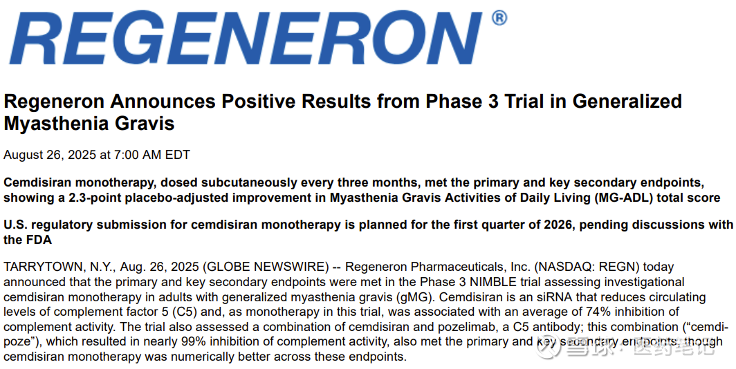 2025年8月26日,再生元宣布C5 siRNA新药Cemdisiran治疗全身型重症肌无力(gMG)的三期临床BIMBLE达到主要终点和关键次要终点。