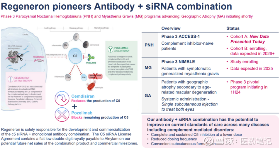 Pozelimab为再生元开发的C5抗体,2023年获得FDA批准上市,用于治疗蛋白丢失性肠病(CHAPLE)。Cemdisiran为一款再生元与Alnylam联合开发的C5靶向siRNA疗法,再生元还在探索PNH、地图样萎缩等多个适应症。