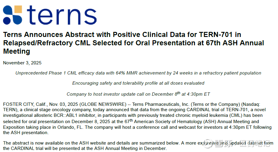 2025年11月3日,Terns Pharmaceuticals公布新一代BCR-ABL变构抑制剂TERN-701治疗CML一期临床数据,并将在ASH会议上做口头报告。