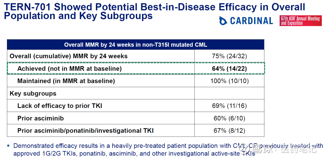 TERN-701治疗24周,获得历史最佳MMR数据,且对于Asciminib及其他TKI治疗后的患者仍然有60-70%的MMR。