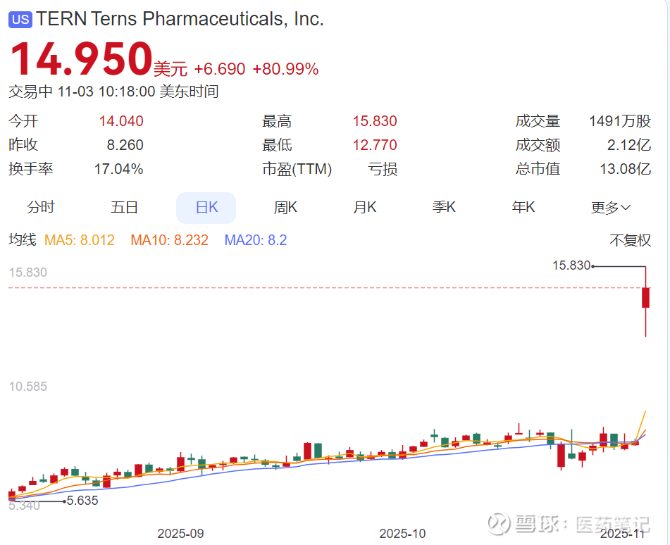 受此消息影响,Terns Pharmaceuticals当天股价大涨80%,目前市值为13亿美元。