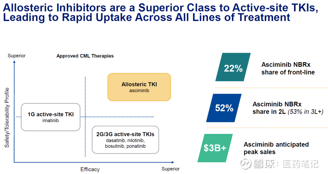 CML目前标准治疗包括活性位点TKI和变构TKI如Asciminib,其中Asciminib占据主要市场份额,预计销售峰值超过30亿美元。
