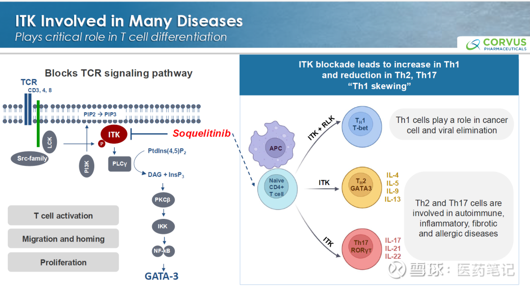 Soquelitinib阻断TCR通路,Th1增加而Th2、Th17下调,后两者在自免疾病中发挥重要作用。