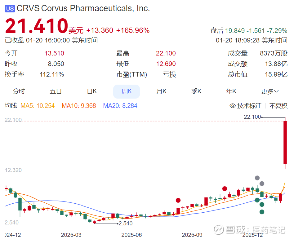 Corvus Pharmaceuticals当天股价大涨166%,市值达到16亿美元。