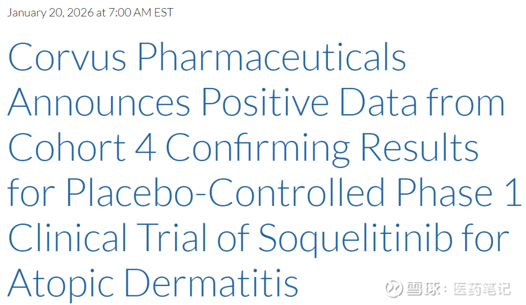 2026年1月20日,Corvus Pharmaceuticals公布了ITK抑制剂Soquelitinib治疗特应性皮炎一期临床最新数据。