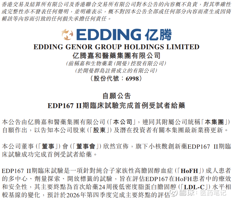 2026年2月7日,亿腾嘉和宣布ANGPTL3 siRNA新药EDP167完成二期临床试验首例受试者给药。EDP167此次开展的是一项针对纯合子家族性高胆固醇血症(HoFH)成人患者的多中心、剂量探索、开放标签的试验,主要终点为给药24周后LDL-C水平相较基线的变化,预计于2026年Q4完成主要终点的评估。