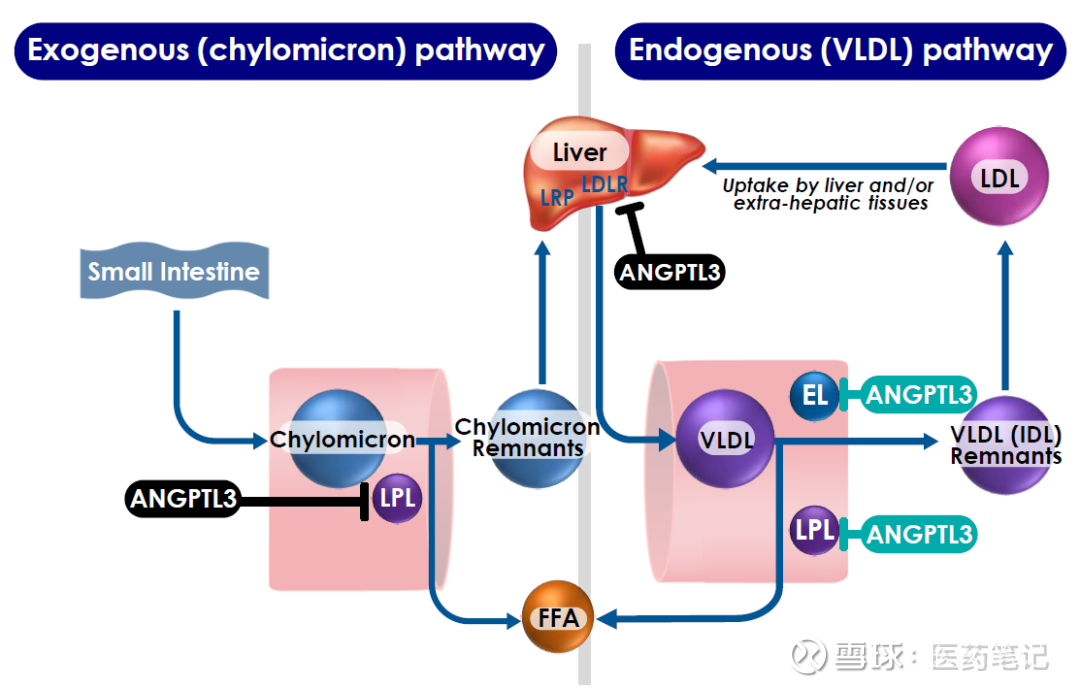 ANGPTL3为降脂领域重要潜力靶点,ANGPTL3可以通过抑制N端脂蛋白脂肪酶(LPL)活性提高血浆TG浓度,以及抑制内皮脂肪酶(EL)活性,通过VLDL受体和其他受体(如LDL受体相关蛋白)促进高水平极低密度脂蛋白(VLDL)残粒的清除。因此,ANGPTL3 siRNA抑制ANGPTL3的表达,来达到降低TG、降低LDL-C的目标。临床上ANGPTL3抗体已经获批上市,小核酸药物则有望进一步提升疗效,延长给药周期。