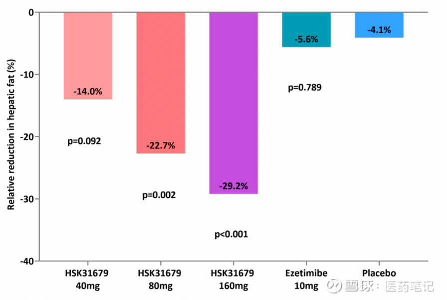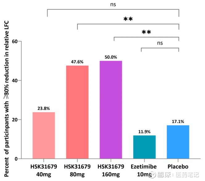 HSK31679为海思科自主研发的THR-β激动剂,2024年EASL大会上披露了治疗MAFLD的初步临床数据。HSK31679治疗第12周,HSK31679 40mg、80mg、160mg、安慰剂组LFC分别下降14.0%、22.7%、29.2%、4.1%。对于LFC较基线下降≥30%的比例,10mg依折麦布组为11.9%,安慰剂组为17.1%;HSK31679 40mg组为23.8%,80mg组为47.6%,160mg组为50.0%。