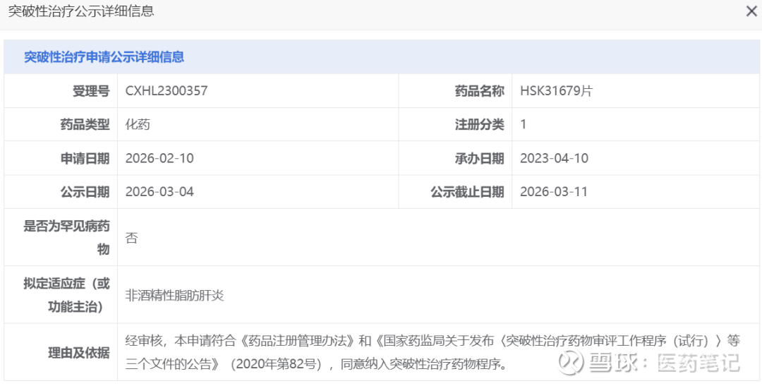 2026年3月4日,海思科HSK31679片拟获纳入突破性治疗药物程序,用于治疗非酒精性脂肪肝炎。