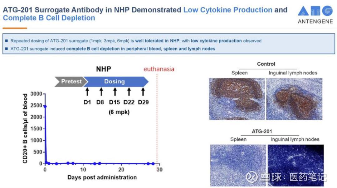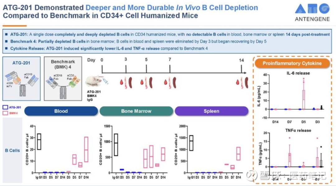 临床前体内实验中,ATG-201可以有效清除外周、骨髓、脾脏的B细胞,而IL-6、TNFα等细胞因子释放显著减少。