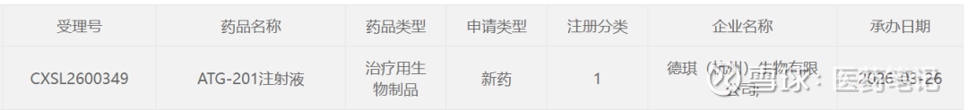 2026年3月26日,德琪医药ATG-201注射液的临床试验申请获得NMPA受理。
