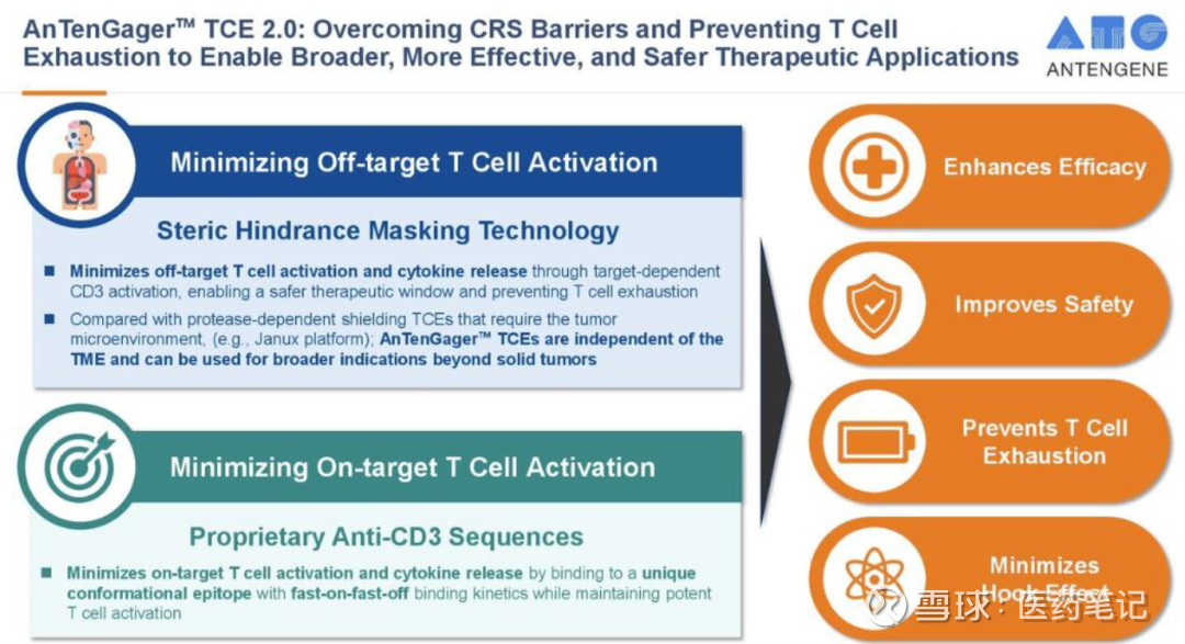 AnTenGager的独特设计提升了疗效,改善了安全性,避免了T细胞衰竭,减少了钩子效应(存在最优剂量,更高剂量反而导致疗效下降)。