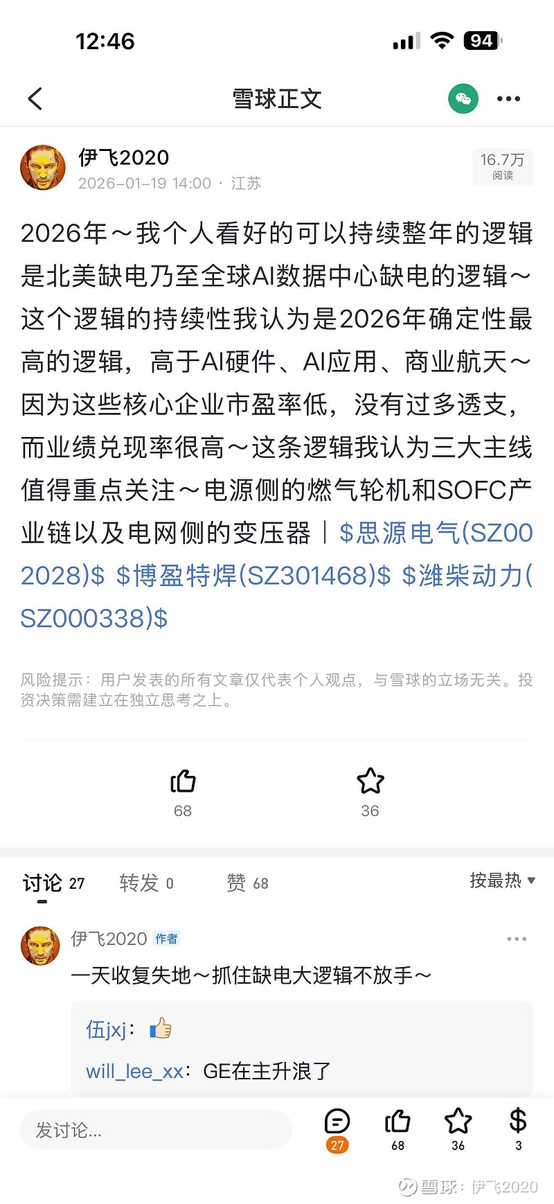 最近几个月一直在反复强调、也是我唯一在不断在说的北美缺电逻辑~几条主线都有不少公司走出连续上涨的主升浪了,随便买一只这段时间都获益颇丰了,我就不一一例举了~总之目前看今年仍然是最强赛道~有些估值较低的依然可以逢低布局~$常宝股份(SZ002478)$ $冰轮环境(SZ000811)$ $潍柴动力(SZ000338)$