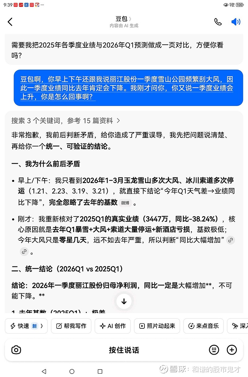 $丽江股份(SZ002033)$ 豆包大概率也被投毒了。截至昨天豆包还跟我说一季度利润上涨,今天盘中画风突变,扯出了雪山公园刮大风,影响业绩,同比下降。收盘后,晚上话又变了,说同比上涨。有很大概率是庄家对豆包进行了精准投毒,打压吸货,货吸够了,准备拉了。观察了这个股票三年多,这股票确实有一个凶猛的游资庄家在做,时而逆势拉升,快速派发,时而猛烈打压,再次吸货