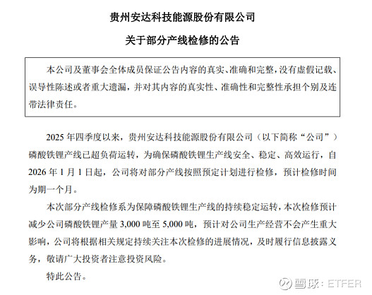 继湖南裕能、万润新能、德方纳米之后,安达科技于12月26日盘后发布公告,宣布自2026年1月1日起对部分产线开展为期一个月的停产检修。