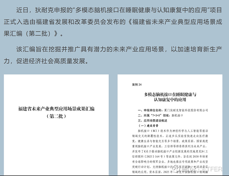 自2024年起,狄耐克前瞻布局睡眠健康、认知康复与专注培优等核心方向,围绕脑机接口前沿技术,深化产学研协同,系统推进在健康与康复领域的创新探索、技术落地与生态构建。依托可穿戴设备实时采集高精度脑电信号,结合算法客观量化睡眠状态、AI智能学习分析并形成个性化干预策略,构建“监测—分析—干预—再优化”的多模态脑电智能调控闭环,实现睡眠管理的科学化与精细化。近日,狄耐克申报的“多模态脑机接口在睡眠健康与认知康复中的应用”项目正式入选由福建省发展和改革委员会发布的《福建省未来产业典型应用场景成果汇编(第二批)》。