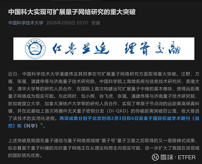 $科大国创(SZ300520)$ 中国科学技术大学官微发布消息,近日,中国科大潘建伟及其合作研究人员在可扩展量子网络研究方面取得重大突破——在国际上首次构建出可扩展量子中继的基本模块,使得远距离量子网络成为现实可能;实现了单原子节点间的远距离高保真纠缠,并在此基础上首次将器件无关量子密钥分发(DI-QKD)的传输距离突破百公里,极大推进了该技术的实用化进程。