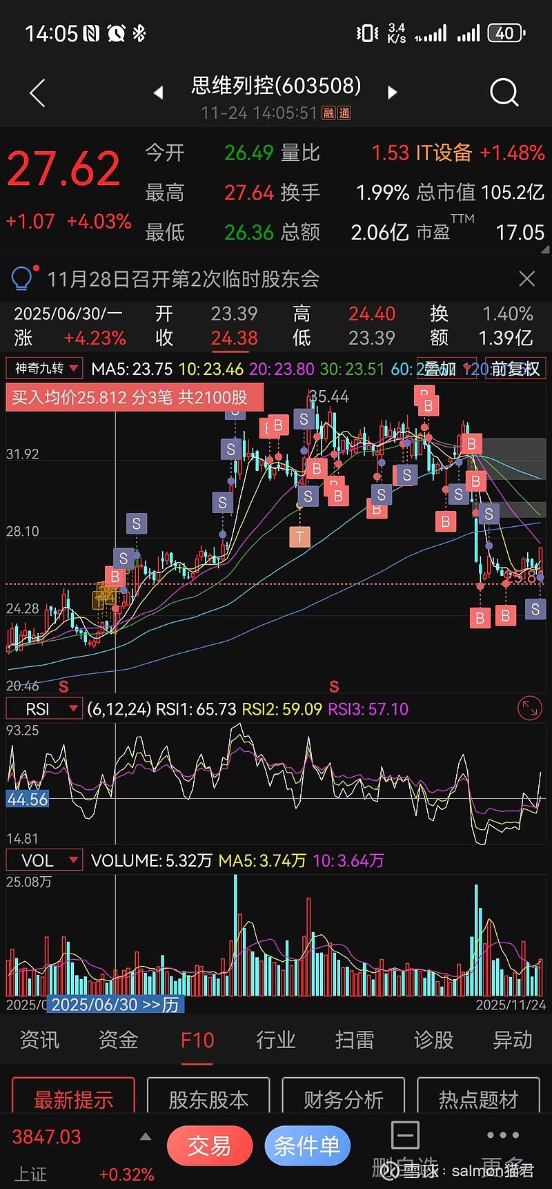 $思维列控(SH603508)$ $上证指数(SH000001)$终于快回本了,等回本后降低一点点仓位,增加些流动性,这位置就做底仓吧,也确实没有找到比它更有性价比的股票了。这个位置离我第一次建仓的位置高了几块钱,因为中报大比例分红了,所以K线的买入价位置变高了。10月份我又大加了仓位,所以成本变高了很多,10月底大跌就亏了。成本虽然高了但持仓量高了几倍,也算失之桑榆收之东隅吧,也不要指望就这样上去了,至少要等到明年财报季可能才会有比较大的涨幅吧。