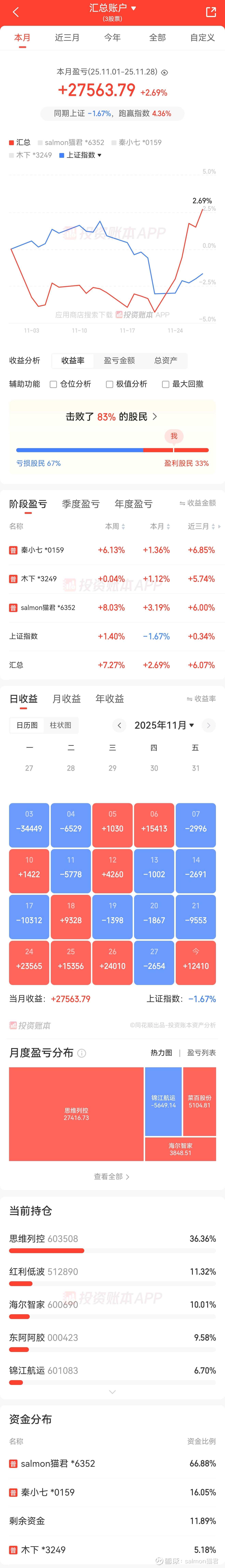 本月盈利27563元,收益率2.69%,跑赢上证4.36%。
