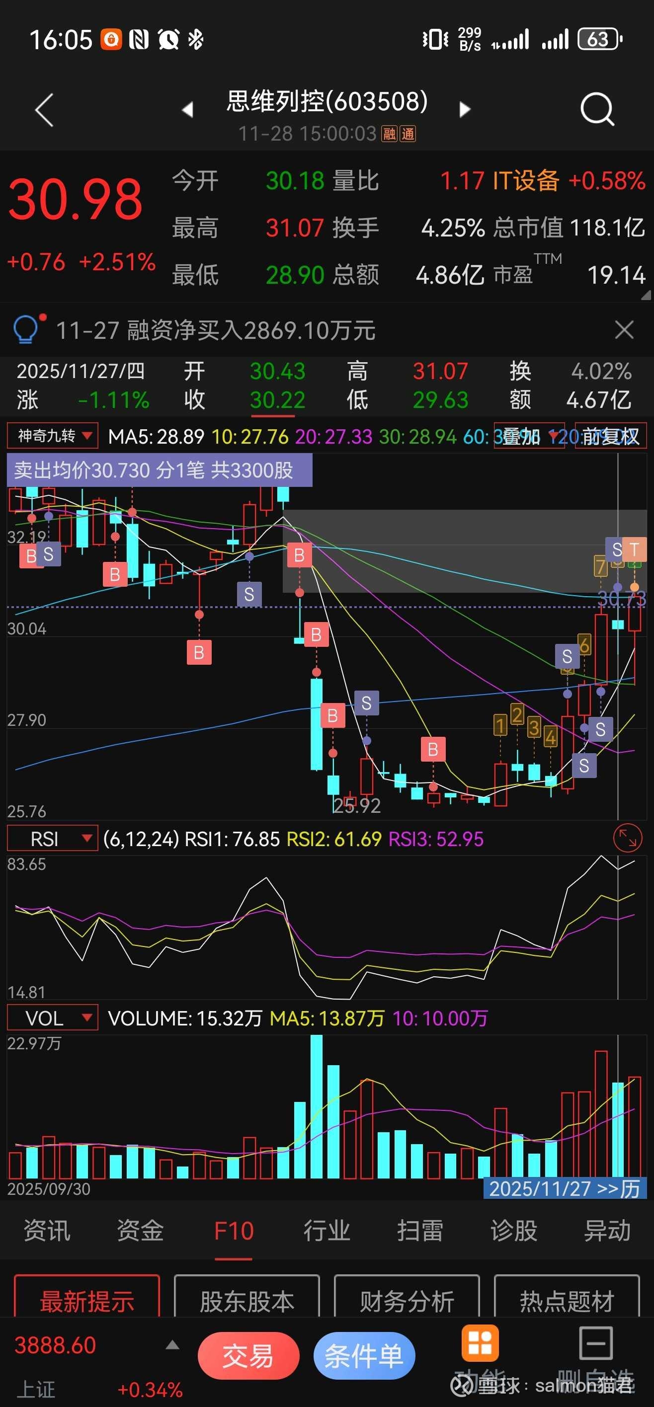 基于个人资金流动性需求,减仓1/4,继续看好后市,相信四季度业绩思维可以交出让人满意的答卷。详细股票分析请参考我发布的专栏:“思维列控:十五五双轮驱动+技术升级,订单与利润共振的高确定性标的”网页链接