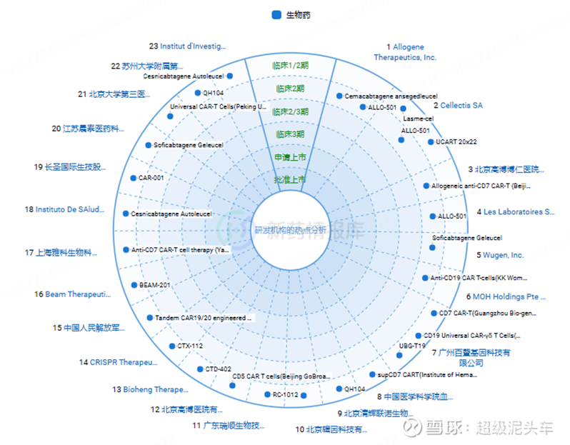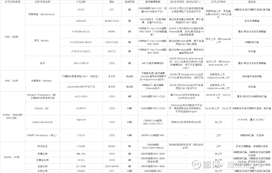 经过AI进一步筛选,保留有相关数据信息的,并添加一些有名的国内其他企业:Allogene、Cellectis、CRISPR Tx、清辉联诺、博雅辑因、百暨基因、301医院、Wugen、Cellectis、高博医院、科济药业、邦耀生物、优赛诺、亘喜生物、Caribou、启函生物、北恒生物。同时,各大MNC也在积极布局。