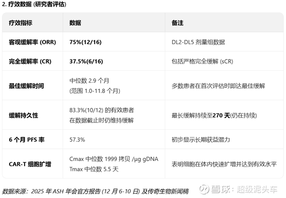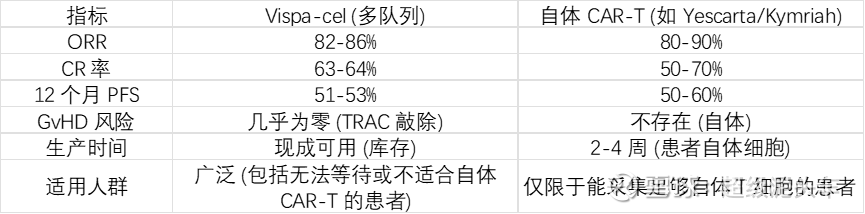 l 将其1期临床CaMMouflage 试验(N=30,截至2025.9已有12名患者数据)2025.11.3和同靶点同适应症自体CAR-T产品的3L临床比较,数据如下: