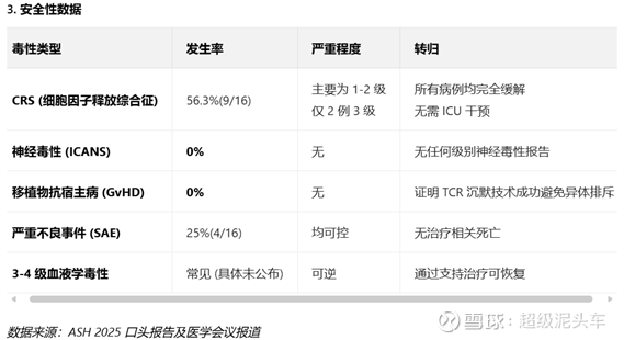 安全性上来说和以往的通用型CAR-T一样极高,细胞因子释放综合征 (CRS)发生率可控,无≥3 级 ICANS 报告;血液学毒性属于常见问题,经支持治疗可恢复;未观察到显著器官毒性。