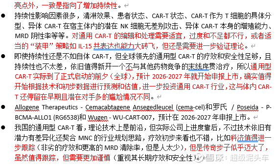 l 再次验证了通用型CAR-T安全性发展到了明确超越普通CAR-T,疗效也能做到理论上非劣,就是持久性这一之前的硬伤,虽然有各种方案优化,但还是需要进一步验证和完善。
