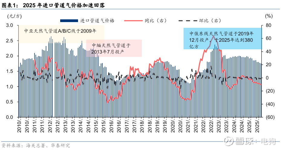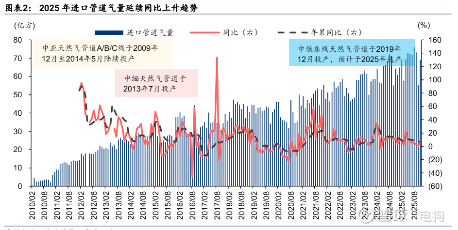 “2025 年 1-11 月国内进口管道气量已达 752 亿方、同比+7.6%,核心依托中俄东线输气能 力爬坡;随着 2026-2027 年中俄东线产能从 380 亿方提升至 440 亿方、中俄中线(500 亿 方/年)推进及远东线(120 亿方/年)2027 年投产,2026/2030 年俄气在进口管道气量占 比将达 47%/55%,年输气量有望突破 1430 亿方。价格端,基于原油价格先降后升(2026 年 62 美元/桶至 2027 年 64 美元/桶)的假设,2026-2027 年进口管道气均价或将从 1.85 元/方降至 1.52 元/方、降幅 18%,其中中俄东线因油价敏感度较低(油价变动 10%对应价 格同向变动 5.0%),价格从 1.38 元/方降至 1.16 元/方(-16%),中亚线因敏感度最高(6.4%) 降幅达 20%(2.19 元/方至 1.76 元/方),中缅线降幅 8%(2.74 元/方至 2.52 元/方),中俄 管道气长期成本优势显著。”