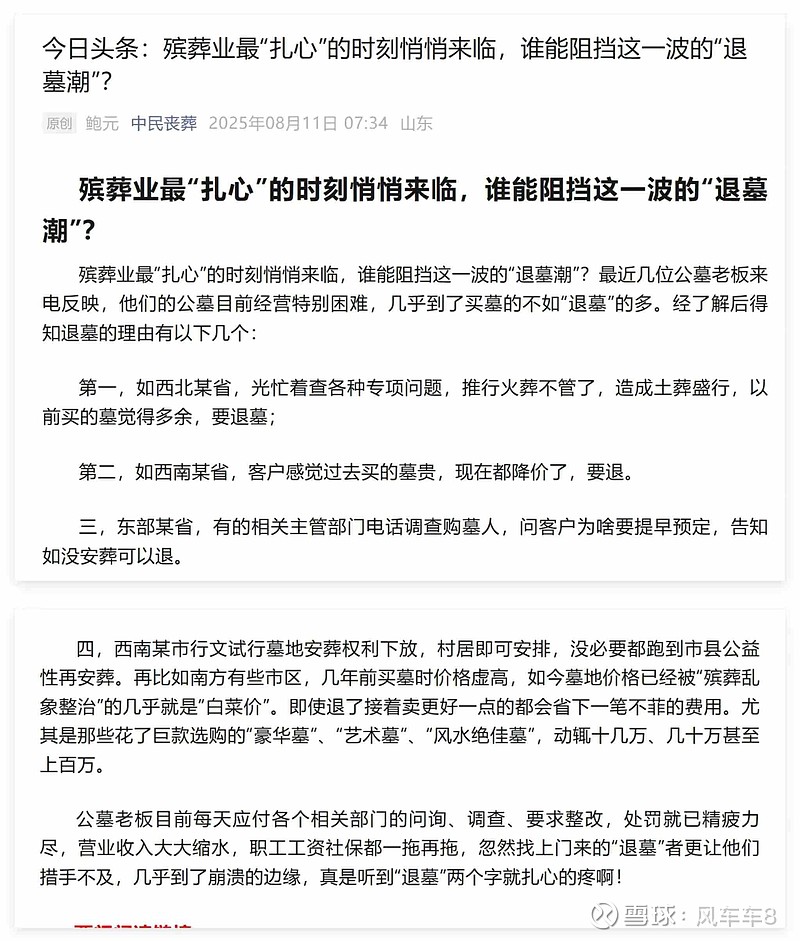 近日,殡葬自媒体 中民丧葬 发表了一篇文章,说是殡葬行业的退墓潮已经来临。看其文章后,笔者与之前认识的几位墓园人员电话交流核实,他们称文章属实,确实新增了很多退墓的客户,特别是那些之前买得价位较高,又一直没有使用的客户,如果退的话,墓园确实是比较头痛,目前还是小范围在退墓,但趋势确实是不太好,退墓或者是要求退墓的客户逐月增多。
