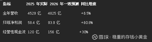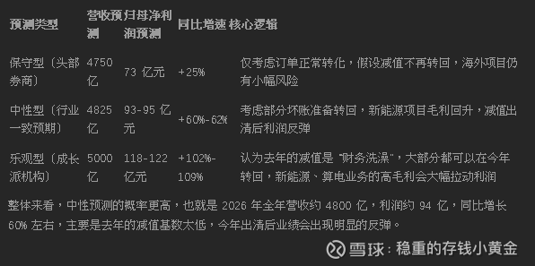 整体来看,中性预测的概率更高,也就是 2026 年全年营收约 4800 亿,利润约 94 亿,同比增长 60% 左右,主要是去年的减值基数太低,今年出清后业绩会出现明显的反弹。
