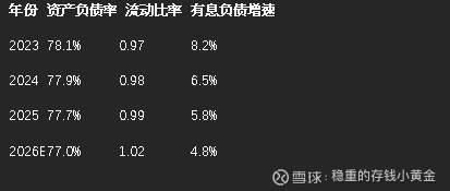 去年的流动比率 0.99,是短期的阶段性数据,2026 年随着现金流改善,短期债务的压力会逐步缓解,有息负债的增速会降到 5% 以下,资产负债率会从 77.7% 降到 77% 以下。