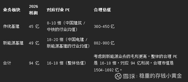 新能源基建业务:对应 18-20 倍 PE,贡献约 48 亿利润,估值约 864-960 亿;