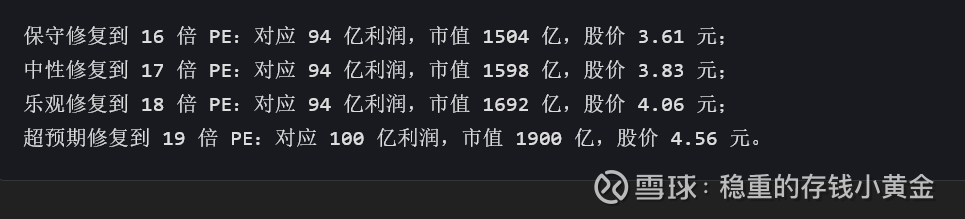 保守修复到 16 倍 PE:对应 94 亿利润,市值 1504 亿,股价 3.61 元;