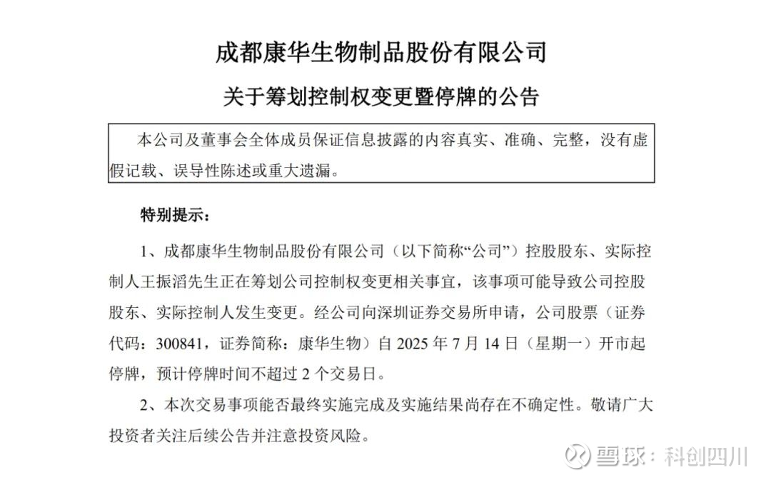 根据公告披露,康华生物于7月11日收到控股股东王振滔的书面通知,各方目前尚未签署任何正式协议,正处于交易方案论证与条款磋商的关键阶段。对于市场最关切的潜在接盘方,公告保持高度缄默,仅强调该事项存在重大不确定性。此次停牌依据《深圳证券交易所上市公司自律监管指引第6号——停复牌》相关规定执行,核心目的在于保障信息披露公平性,避免敏感期股价异常波动损害投资者权益。