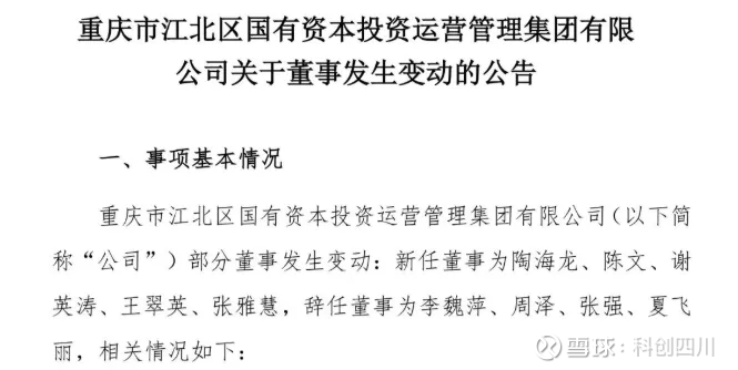 9月19日,重庆市江北区国有资本投资运营管理集团有限公司(重庆江北国投)发布关于董事变动的公告:辞任董事为李魏萍、周泽、张强、夏飞丽。新增的五个董事,张雅慧为职工董事,陶海龙、陈文、谢英涛、王翠英为外部董事。相较于此前,增加了一名外部董事。可以看到,江北区国资委对江北国投,在董事会上的进一步加强管理。